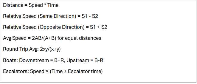 | Relative Motion | 1 – 2 | Draw diagram → Identify relative speed → Time = Distance/Relative Speed |