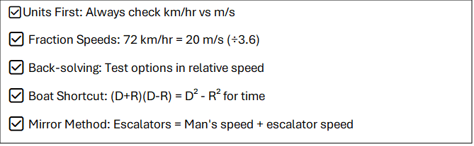 | Trains/Boats | 1 | Convert all to same units (km/hr ↔ m/s: ×5/18) |