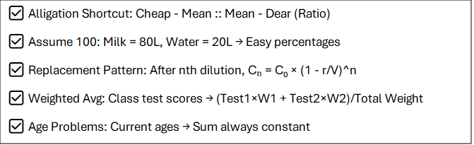 Averages, Mixtures, and Allegations deliver consistent high-ROI questions in CAT QA, testing weighted averages through ratio logic rather than complex algebra. Though it’s a complex topic, once you learn to apply the formula, you can crack any question type from this topic.